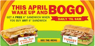 B1G1 Free at Subway before 9 am all April