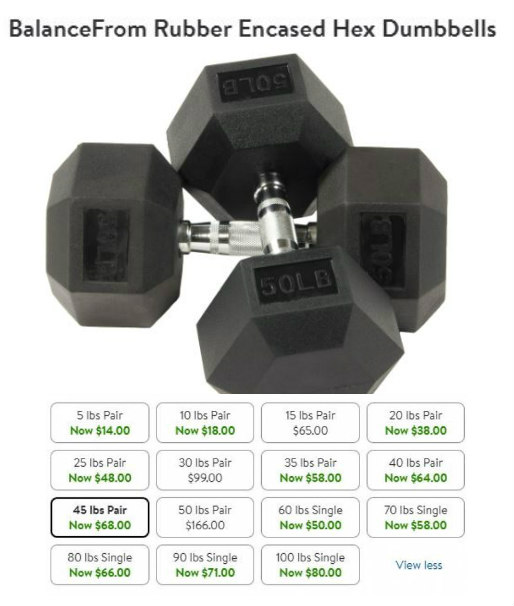 BalanceFrom Rubber Encased Hex Dumbbells $14.00 – $80.00 (reg $24.99 – $119.99)