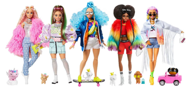 - When it comes to fashion, Barbie Extra dolls have a “more is more” attitude – big hair, statement jewelry and lots of layering help to engage kids in style and storytelling exploration