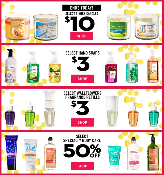 In addition to the $10 3-Wick Candles (price ends today, July 3), you can find lotions and other Signature Body Care Items from $3, Hand Soaps for $3, Wallflower Refills for $3, and more!