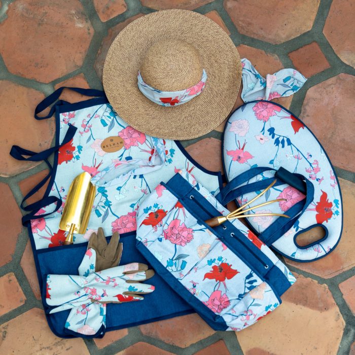 - 5 piece set includes sun hat, kneeling pad, gloves, work apron, and garden tool bag