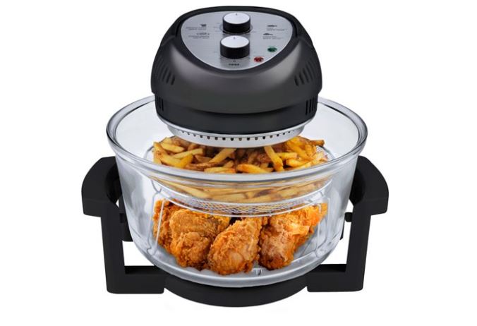 - Fries foods without oil by using halogen, convection, and infrared heat