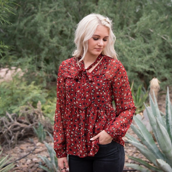 This pretty top features an adorable necktie, gathered waist, and flowy bottom to bring you both elegance and comfort!