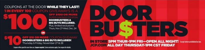 The JCPenney Black Friday ad has been released! Store are opening on Thursday at 5 pm, and doorbusters run through Friday at 1 pm. Be sure to check out the $100 Coupon Giveaway; 1 in every 100 coupons will be a $100 off a $100 purchase! There will also be $10 off $10 or more coupon giveaways, and Friday 6 am to 10 am you can get $20 bonus cash when you spend $5 or more in store. Some of these deals may be available ONLINE, too!