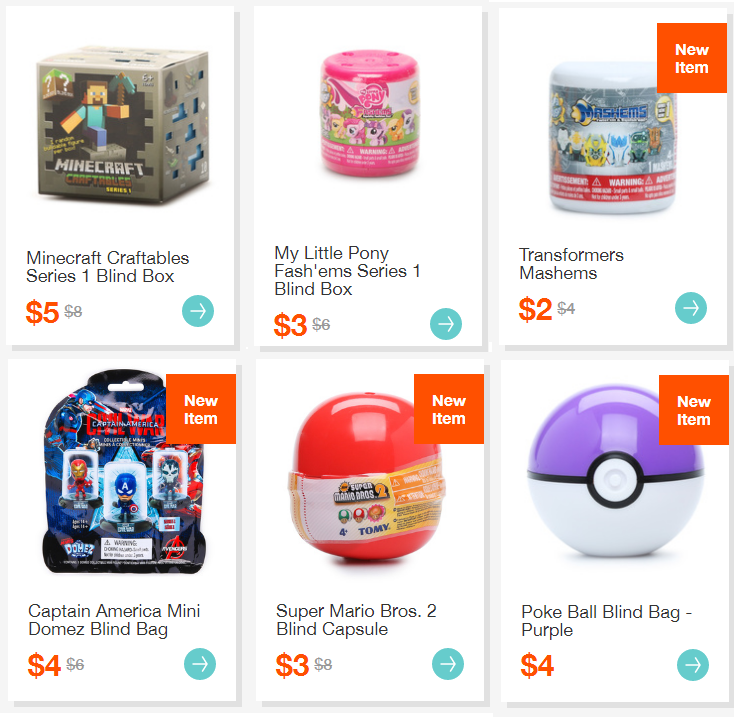 Choose from a variety of Blind Bags, including Super Mario Bros., Poke Ball, Transformers, Minecraft, My Little Pony, and more!
