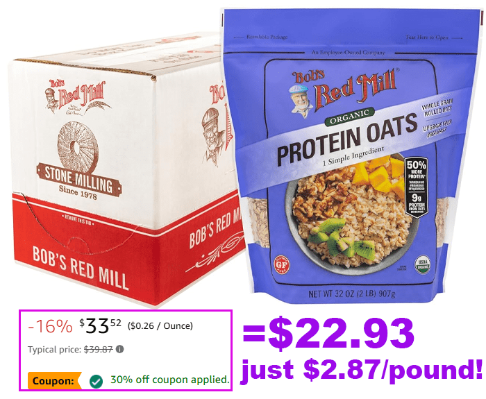 Bob’s Red Mill Organic Protein Oats – 32 oz (Pack of 4) for $35.28 (Reg $39.87)
