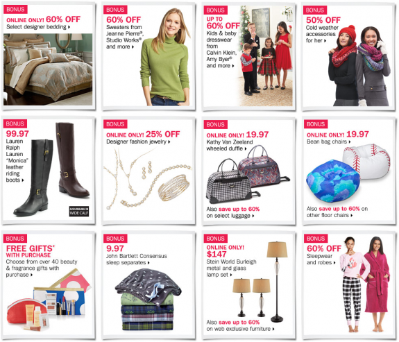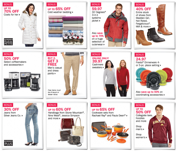 CYBERMON15NSave an extra 25% on sale price women’s, men’s and kids’ apparel categories except dresses, maternity and outerwear; sale price fine jewelry; save an extra 15% on sale price accessories, handbags, dresses, ladies’ suit separates, footwear, intimate apparel, ladies’ and men’s outerwear, maternity, home store and luggage; save an extra 10% on sale price fashion watches, toys, kitchen electrics, personal & floor care merchandise, and consumables. *Exclusions Apply*