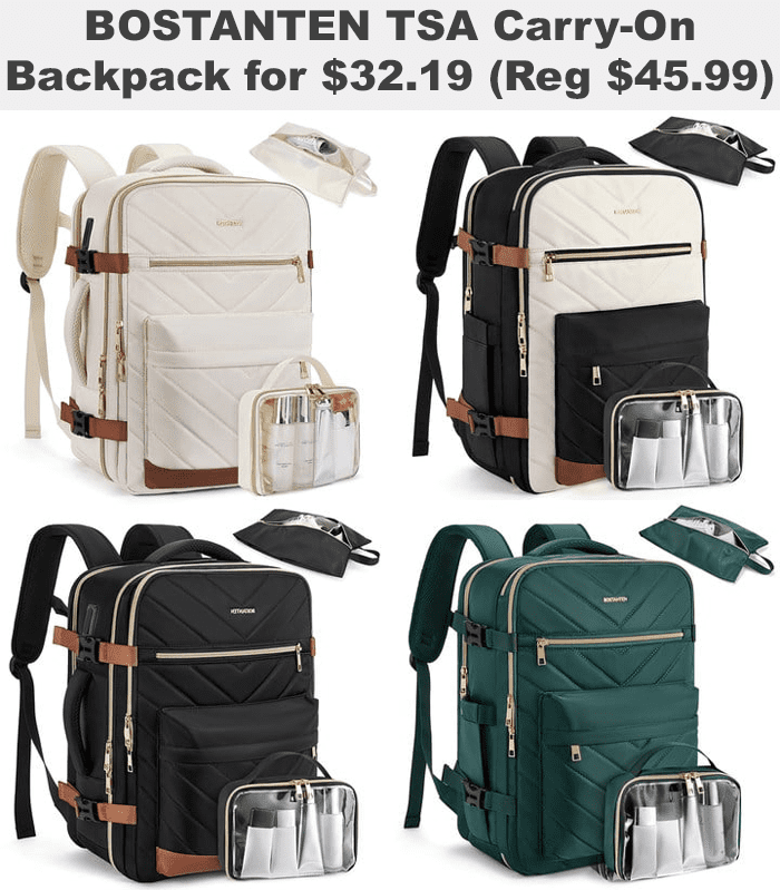 I love my travel backpack! This is a bargain on some really great colors! They include a waterproof toiletry bag and a shoe bag that can hold up to 2 pairs of shoes. This backpack also has a USB port for easy charging to your power bank. Since they can fit under the seat of most airlines, they’re considered a personal item!