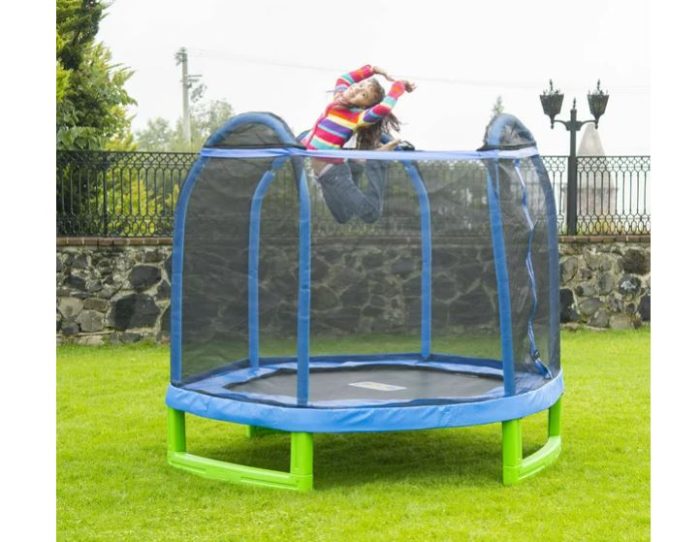 - Bounce Pro My First kid’s trampoline stands at 7′ following assembly