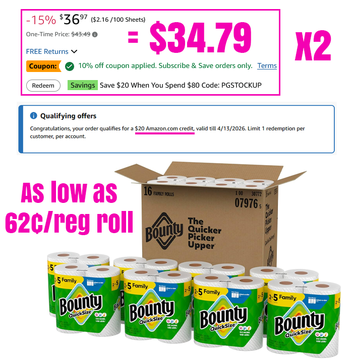 - Add TWO to your Subscribe and Save order because they’re part of this promo where you’ll get a $20 Amazon Credit when you spend $80