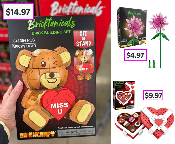 I spotted these building sets at my local store today. They’re REALLY cute! The bear can sit or stand! Customize the chocolates in the heart-shaped chocolate box, and create unique floral arrangements with the adjustable flowers.