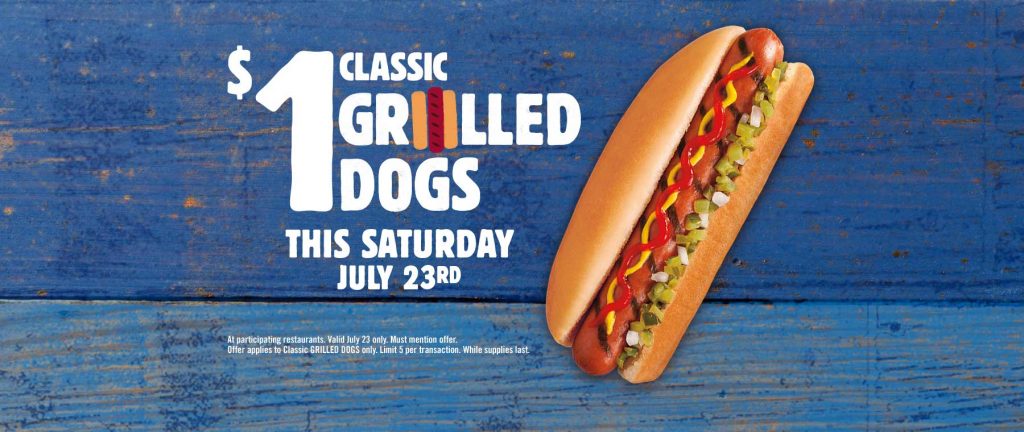 Make tomorrow an easy lunch dinner or snack with their $1 Classic Grilled Hot Dog on 7/23/16.