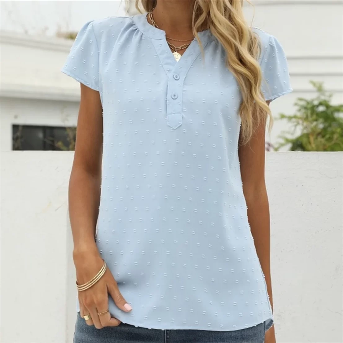 Solid colored dotted top with short doll sleeves. A simple cute item to wear to work or on the weekends.