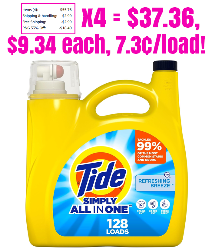 For example, add 4 Tide Simply All-In-One Liquid Laundry Detergent, Refreshing Breeze Scent, 128 Loads, 168 fl oz to your cart.