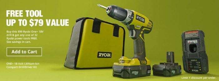 First, add a $99 Ryobi One+ 18V Drill to your cart, then select a FREE Power Tool valued at up to $79! There’s a nice selection available; you can choose a Reciprocating Saw, Orbital Jig Saw, Hammer Drill, or more!