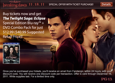 Buy tickets to Breaking Dawn and receive 70% off the Eclipse Blu-ray and DVD combo pack.