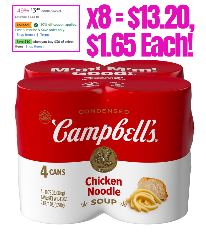 Campbell’s Condensed Chicken Noodle Soup, 10.75 Ounce Can (Pack of 4) for $4 (reg $5.88)