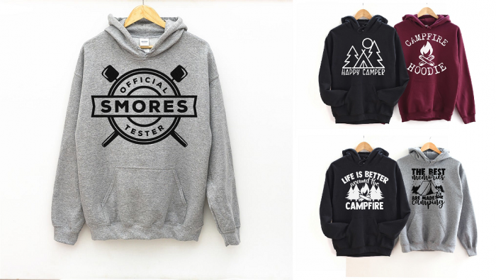 These hoodies are adorable and perfect for anyone who loves camping! There are 8 designs.