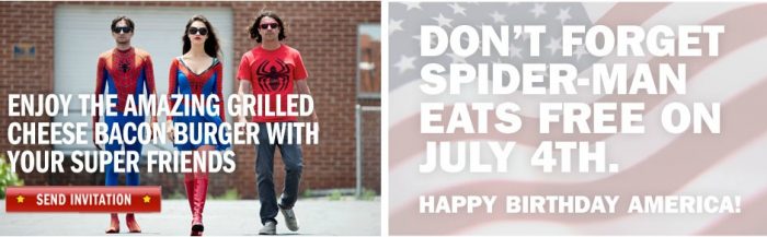 Another great Spidey deal! On Wednesday, July 4, you can get a free Amazing Grilled Cheese Bacon Burger when you are one of the first 50 people to go into a Carl’s Jr dressed like Spider-Man! Check out the details here.