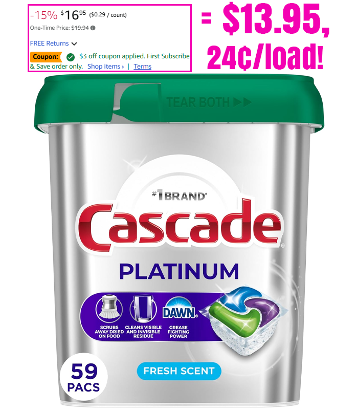 Cascade Platinum Dishwasher Pods, Fresh Scent, 59 Count for $19.94 (Reg $20.99)