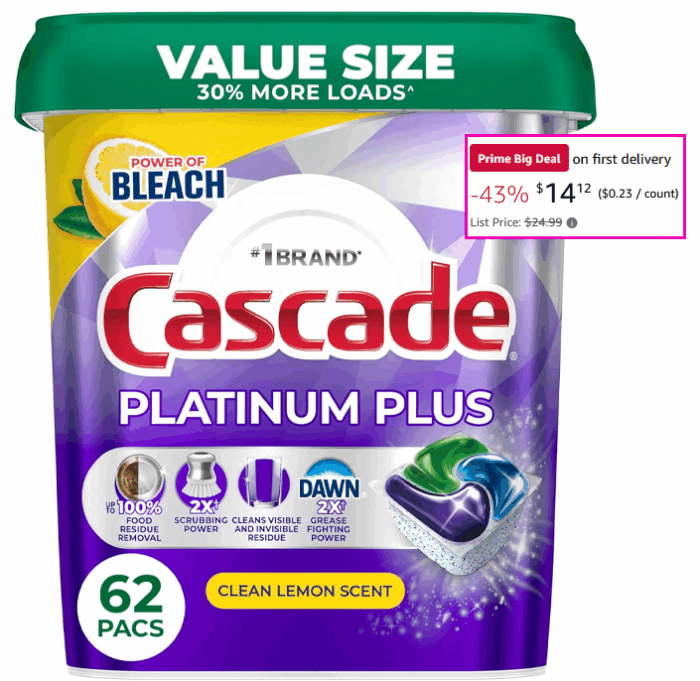 Cascade Platinum Plus Dishwasher Pods, Dish Detergent Soap, Clean Lemon Scent, 62 Count for $16.61 (Reg $24.99)!