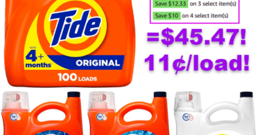 4X – Tide Laundry Detergent Liquid, 132 fl oz, 94 – 100 Loads for $45.47 or $53.44 (Reg $79.76)!11 months agoby Jill