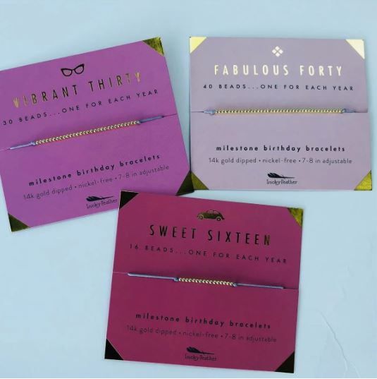 These 14K gold dipped bracelets are perfect gifts for a milestone birthday! There are 15 options available which you can check out HERE. They come with the cute cart and fit inside a greeting card.