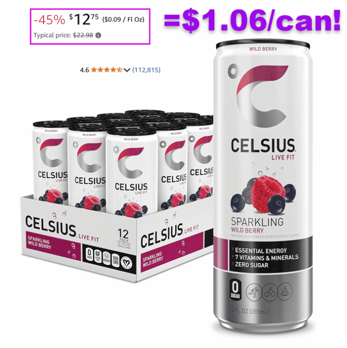 CELSIUS Sparkling Wild Berry, Functional Essential Energy Drink 12 Fl Oz (Pack of 12) for $15 (Reg $22.98)