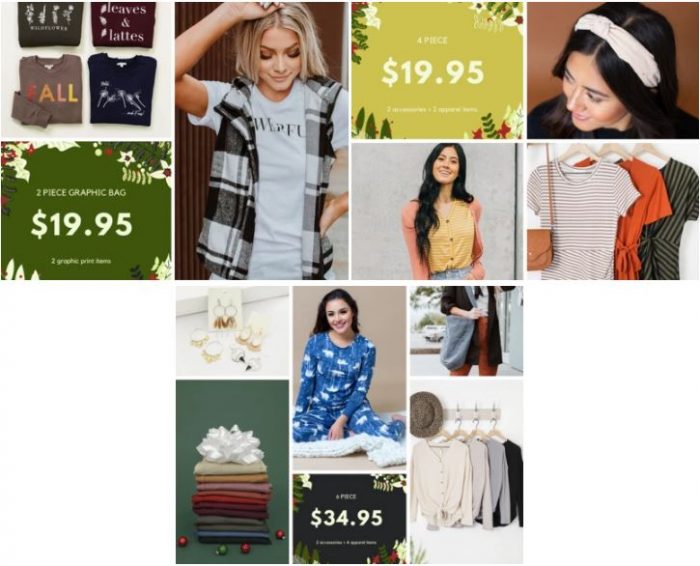 - $19.95 bag includes 2 CLOTHING PIECES + 2 ACCESSORIES ($4.99/item)