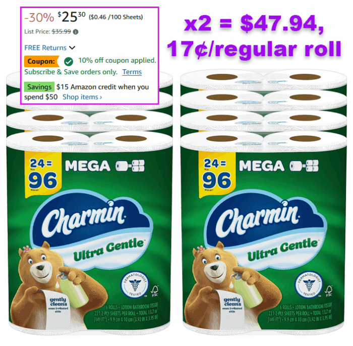 • Pay as low as $47.94 + Earn $15 Amazon Credit. That’s like paying 17¢/regular roll!