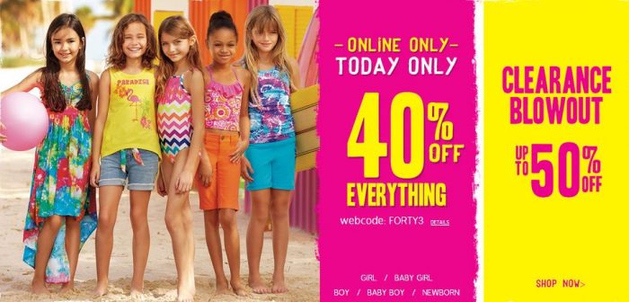 Here’s another awesome deal on clothing for the kids! Today only at The Children’s Place, you can get 40% off EVERYTHING plus FREE Shipping (no minimum)! You’ll just need to use code FORTY3 to get this offer. YAY!