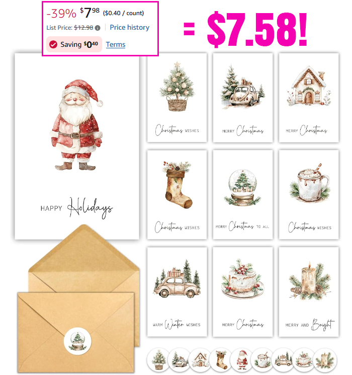 Christmas Cards with Envelopes, Pack of 20 4″x6″, 10 Designs for $7.58 (Reg $12.98)!
