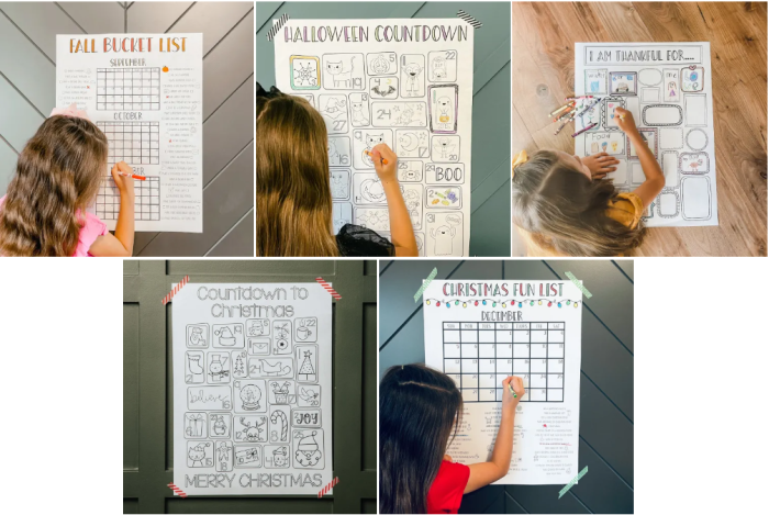 These coloring posters come in 5 options! Kids will love coloring in a square for each day as they countdown to Halloween or Christmas with a darling advent calendar, or marking off the days when you do fun bucke tlist items each season. There is also a special coloring sheet for them for Thanksgiving so they can draw the things they’re thankful for while they’re waiting for their turkey and mashed potatoes.