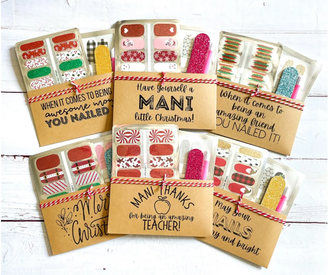 These will make excellent friend and teacher gifts! They include color-coordinating accent nail wraps, the newly released 3-in-1 Cuticle tool, a red glitter nail file, and alcohol wipes, all cutely bundled in a holiday-themed sleeve. Choose from more than 30 designs!