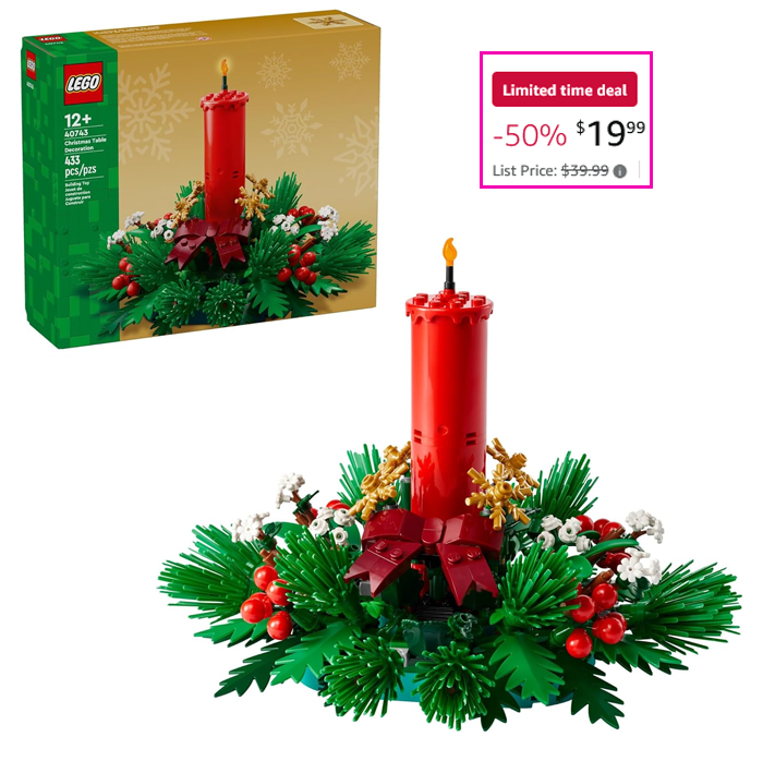 - Festive joy – The Christmas LEGO® set features a red candle at its center, surrounded by red berries, golden stars and green foliage