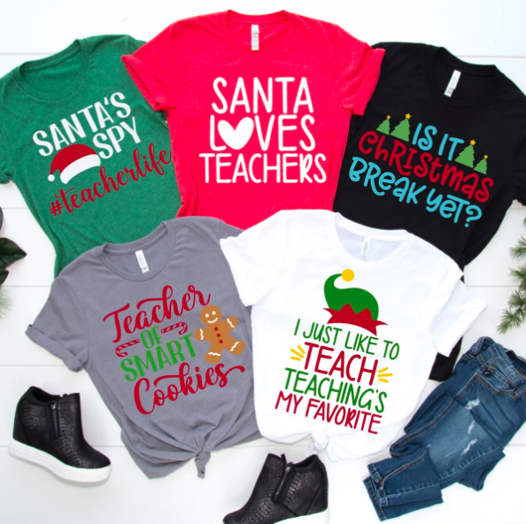 If teaching’s your favorite or if you know Santa’s favorite teacher, then these teacher-inspired holiday tees are perfect for you!