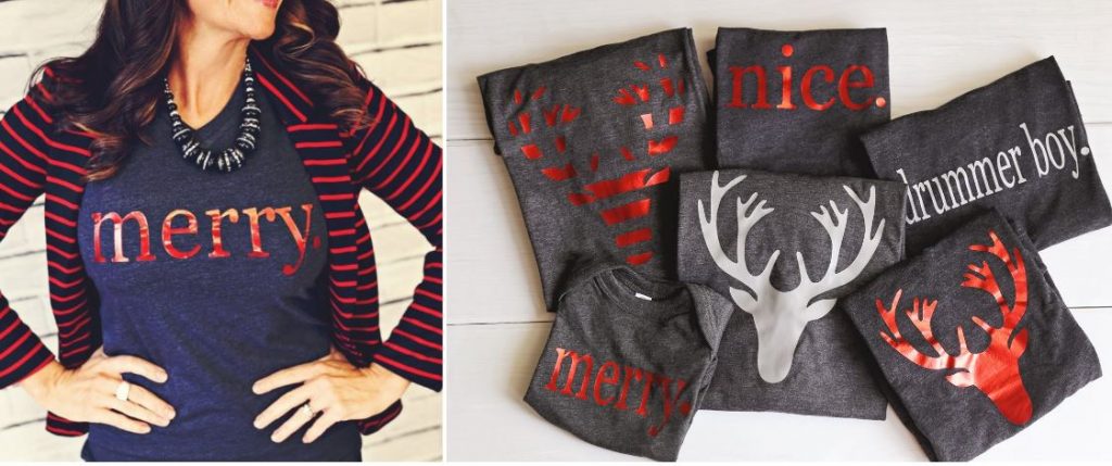 Oh I love this simple and plain tee! All shirts come in a charcoal. V-neck and relaxed unisex fits are available, and you can customize them with metallic red or matte grey lettering. I think these would be super cute for family photos for a Christmas card, or you could even pair them with pajama pants for Christmas PJs!