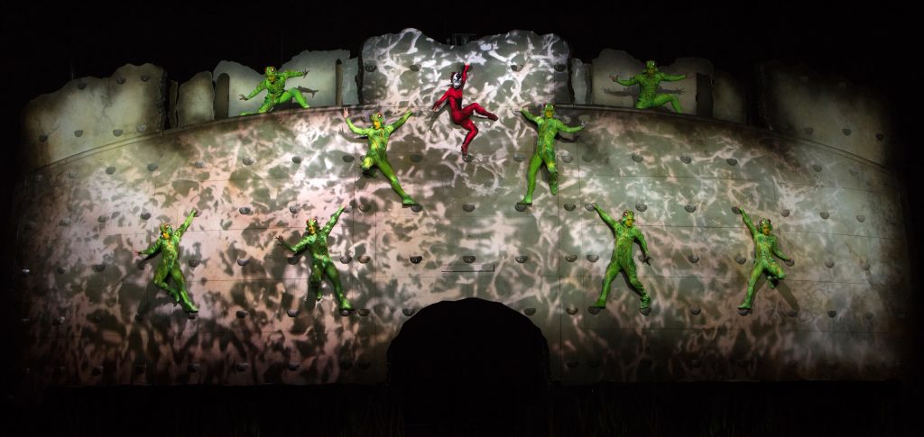 This was also one of my favorite acts! Those green “crickets” would jump on trampolines and land back on the rock climbing wall. And that red spider in the middle was AMAZING. She’d crawl around on that wall upside down, sideways, every which way and looked just like a spooky spider. I loved it!