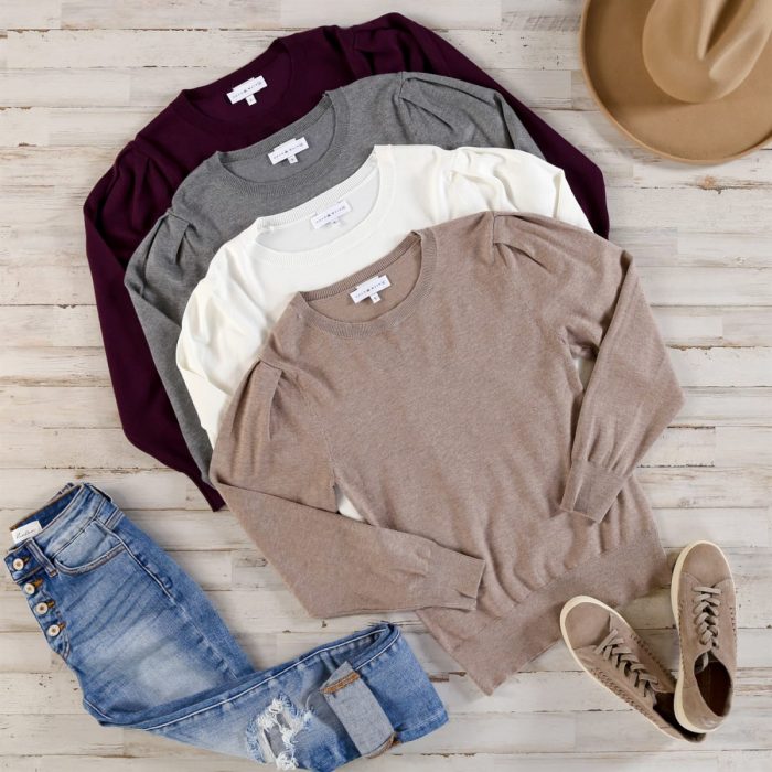 A lovely knit sweater with a crew neckline dropped shoulders and pleated puff sleeves. Perfect for a casual fall day.