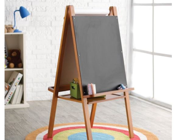 This double-sided easel features a wide, hard surface beneath a pull-down paper roller that can give them hours of creative freedom. A wide tray gives them room to store the all the colors they need, and a central shelf adds extra storage for art supplies while it also gives a bit of extra stability. The easel is crafted from durable, medium-density fiberboard (MDF) with a painted finish in a classic shade of pecan.