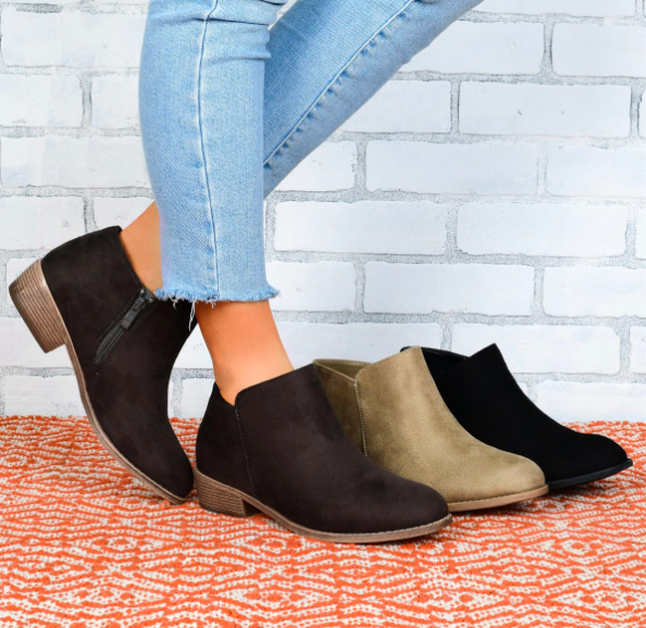 These classic suede ankle-high booties are so adorable! They have a round toe with an inside zipper and comes in 3 great colors.