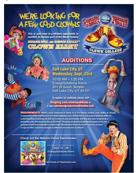 The circus is coming, and for the first time ever residents of Utah will have the opportunity to audition to be a clown in The Greatest Show on Earth! Auditions take place on Wednesday, September 23rd from 10-1:30 at the EnergySolutions Arena, but you must register first at Ringling.com/clownauditions. Click HERE for more info! How fun!
