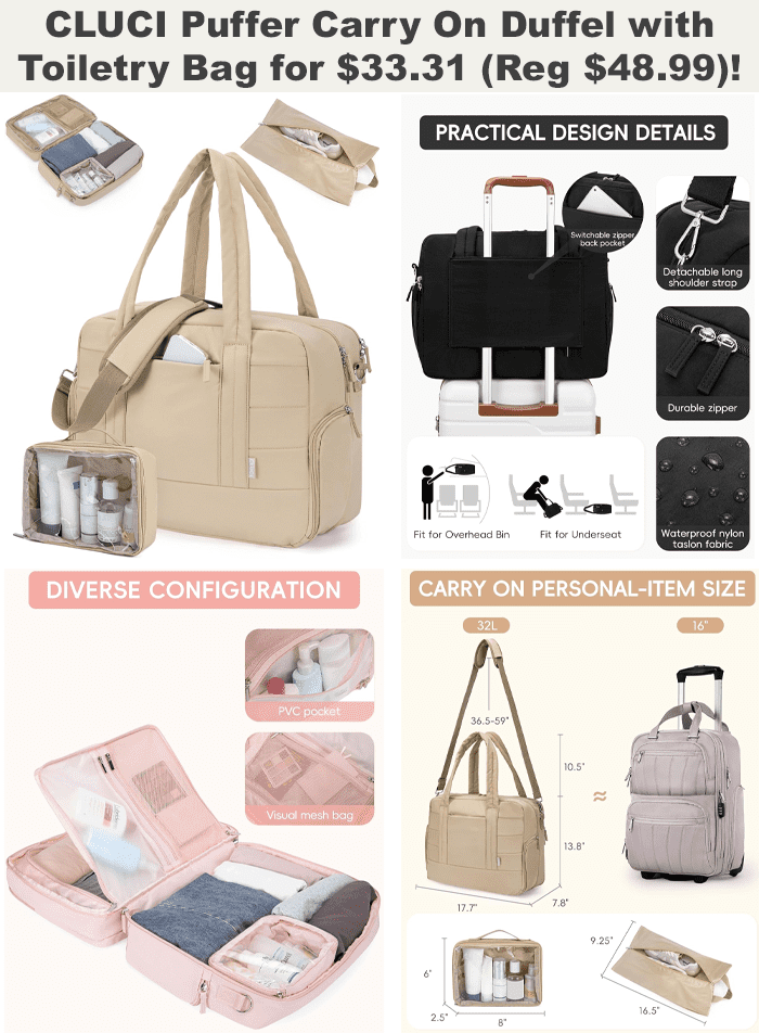 CLUCI Puffer Carry On Duffel with Toiletry Bag for $39.19 (Reg $48.99)