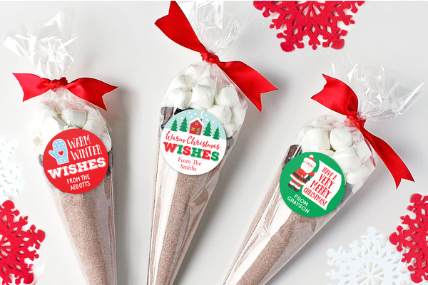 - Give warm winter gifts of hot cocoa with these personalized stickers and bags!