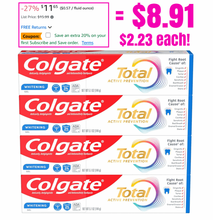Colgate Total Active Prevention Whitening Gel Toothpaste with Fluoride, Mint, 4 Pack, 5.1 oz for $13.71 (Reg $15.99)