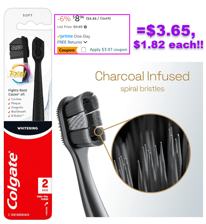 Colgate Total Active Prevention Whitening Toothbrush, Soft, 2-Pack for $8.96 (Reg $9.49)