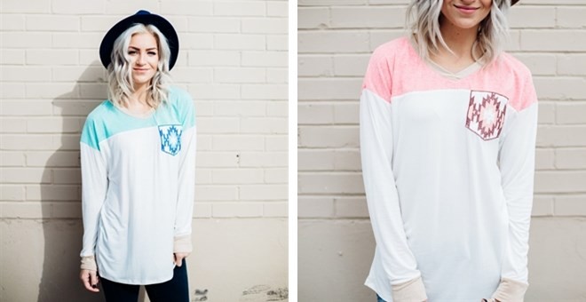 Run for this deal! Grab this Color Block Top with Aztec Pocket for only $4.99.