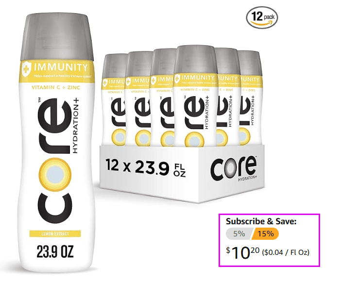 CORE Hydration+ Immunity, Lemon Extract Nutrient Enhanced Water with Vitamin C and Zinc, 23.9 Fl Oz Bottle (Pack of 12) for $12 (Reg $29.88)