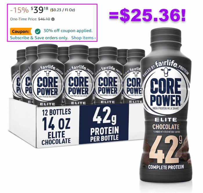 Core Power Elite High Protein Shake, Chocolate, 42g Bottle, 14oz, 12 Pack for $46.10