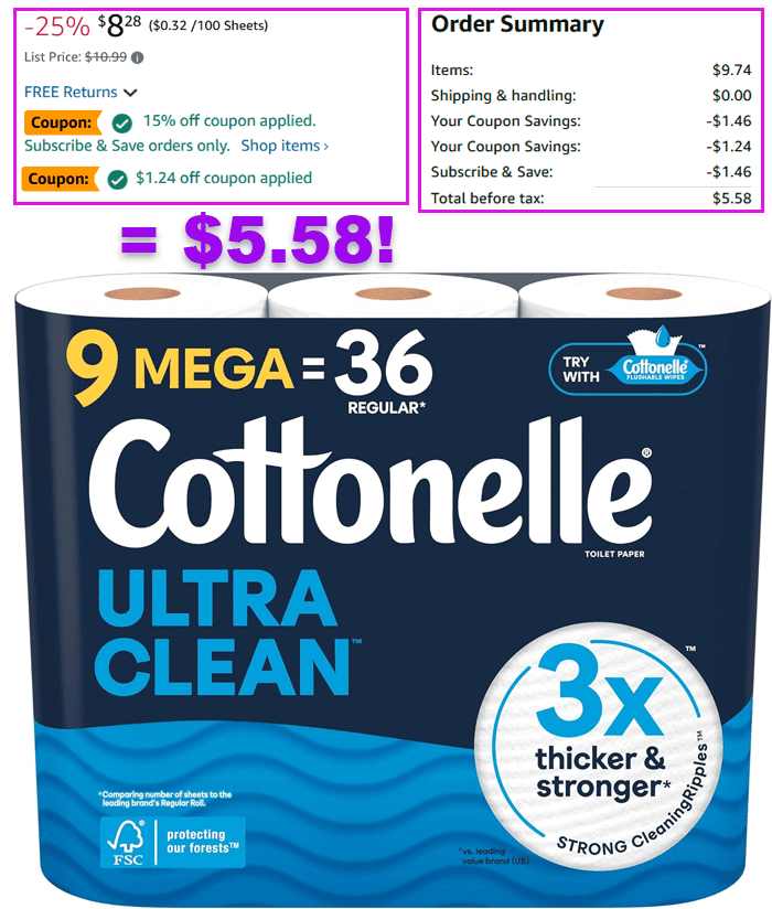 This works out to be 62¢ per mega roll, which is the same as only 16¢ per regular roll! Make sure you follow the steps and include both coupons.
